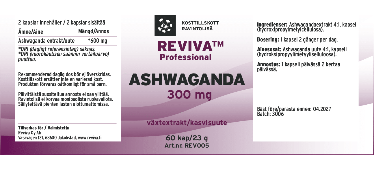 Ainesosat: Ashwagandha-uute 4:1, kapseli (hydroksipropyylimetyyliselluloosa).
