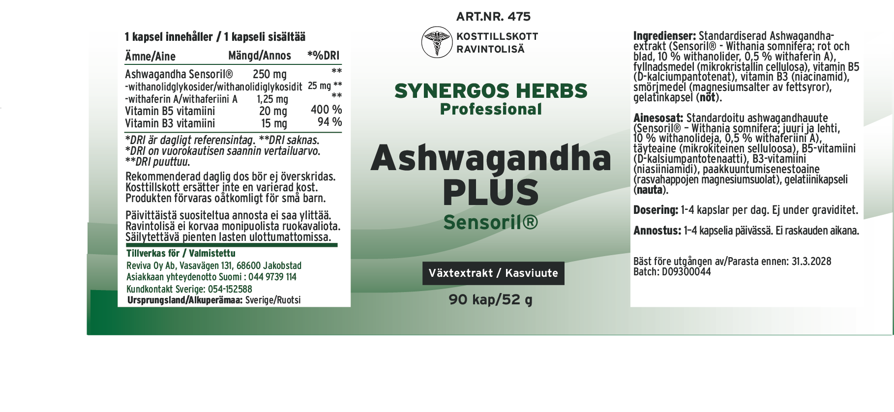 Ainesosat: Standardoitu ashwagandhauute (Sensoril® – Withania somnifera; juuri ja lehti, 10 % withanolideja, 0,5 % withaferiini A), täyteaine (mikrokiteinen selluloosa), B5-vitamiini (D kalsiumpantotenaatti), B3-vitamiini (niasiiniamidi), paakkuuntumisenestoaine (rasvahappojen magnesiumsuolat), gelatiinikapseli (nauta).