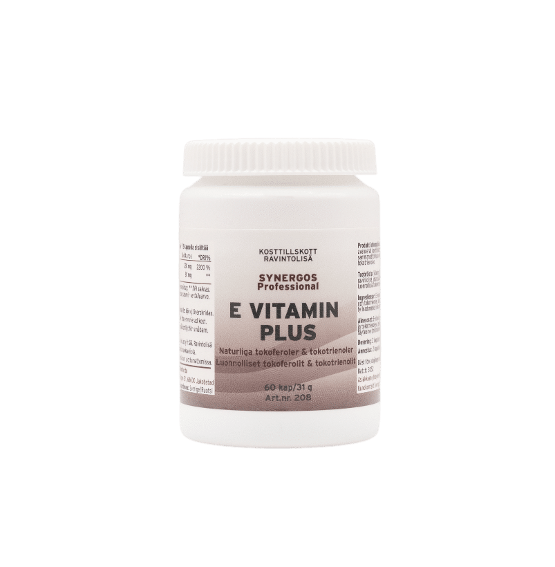 Tuotetieto: Vitamin E Plus on edistyksellinen ravintolisä, joka sisältää laajan koostumuksen luonnollisia tokoferoleja. Jokainen kapseli sisältää 110 mg E-vitamiinia sekä luonnollisia tokoferoleja ja tokotrienoleja, joista 10 mg alfa tokoferolia, 2 mg beta tokoferolia, 27 mg delta tokoferolia, 61 mg gamma tokoferoleja, 15 mg leusiinia, betatokotrionolia, 10 mg tokotrionolia (alfa tokotrienoleja, beta tokotrienoleja, delta tokotrienoleja ja gamma tokotrienoleja).