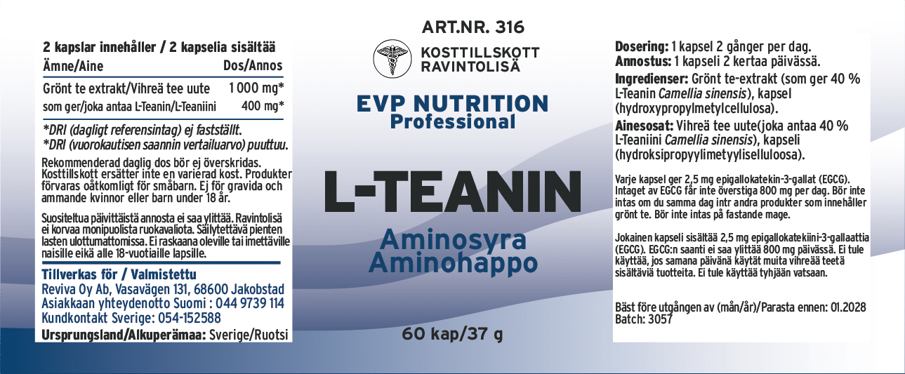 Ravintolisänä L-teaniinia käytetään täydentämään päivittäistä ravintoaineiden saantia hallitulla ja käytännöllisellä tavalla. Kapselimuoto mahdollistaa selkeän annostelun ja tekee tuotteesta helppokäyttöisen osan päivittäistä rutiinia ruokailutottumuksista riippumatta.