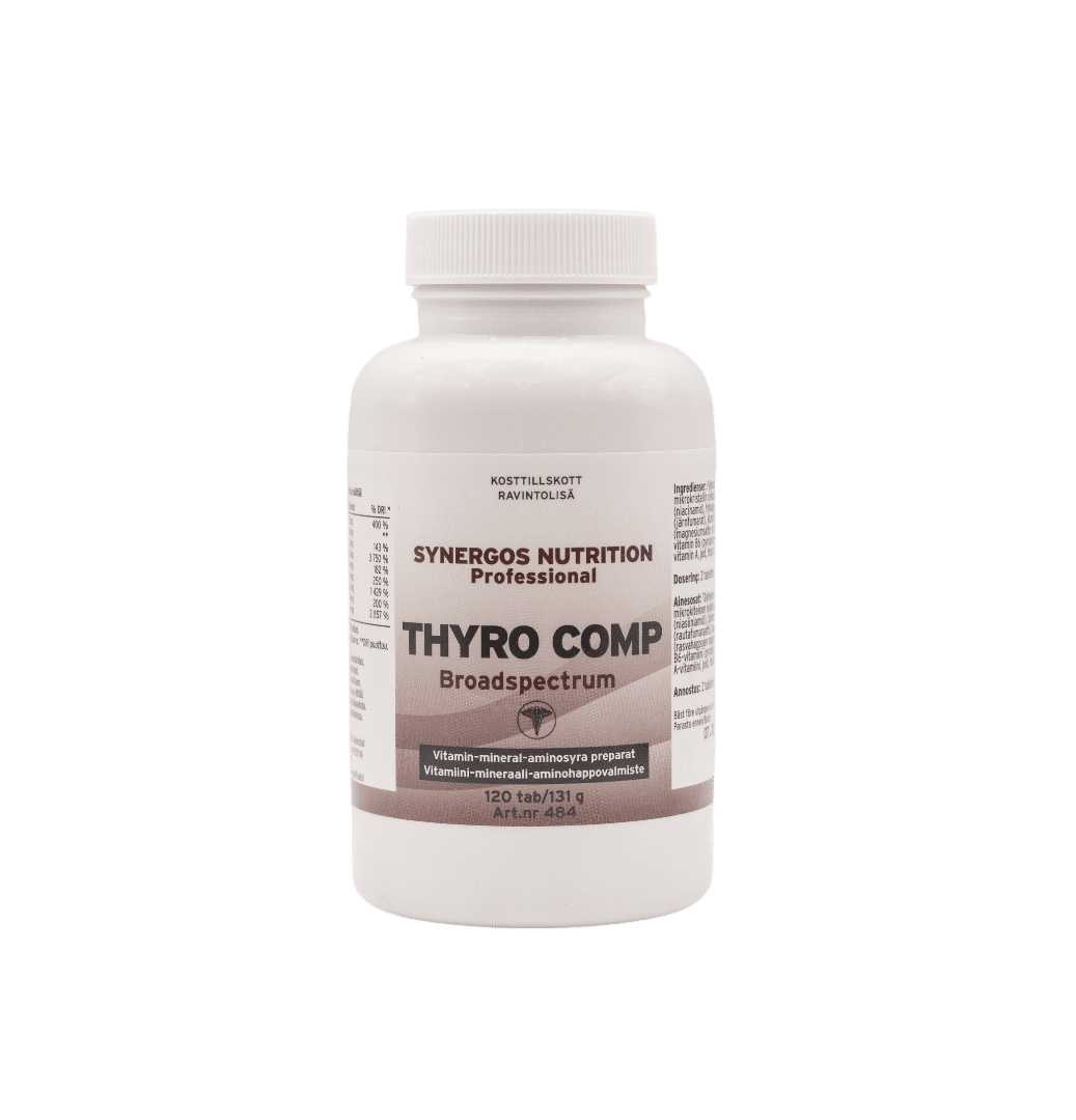 ThyroComp Synergos on ravintolisä, joka perustuu laajakirjo- ja synergiaperiaatteeseen. Se sisältää lukuisia vitamiineja ja mineraaleja, mukaan lukien jodia, joka edistää kilpirauhashormonien normaalia tuotantoa ja kilpirauhasen normaalia toimintaa.
