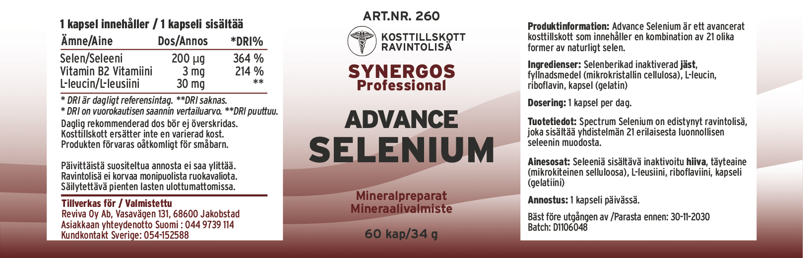 Ingredienser: Selenberikad inaktiverad jäst, fyllnadsmedel (mikrokristallin cellulosa), L-leucin, riboflavin, kapsel (gelatin).