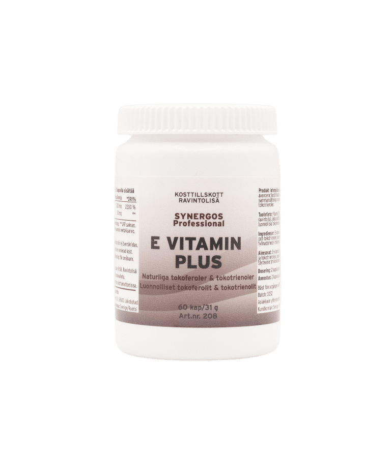 Produktinformation: E-vitamin Plus är ett avancerat kosttillskott som innehåller en bred sammansättning av naturliga tokoferoler. Varje kapsel innehåller 110 mg E-vitamin med naturliga tokoferoler och tokotrienoler varav 10 mg alfa tokoferol, 2 mg beta tokoferol, 27 mg delta tokoferol, 61 mg gamma tokoferol, 15 mg leucin, 10 mg tokotrienoler (alfa tokotrienoler, beta tokotrienoler, delta tokotrienoler och gamma tokotrienoler).