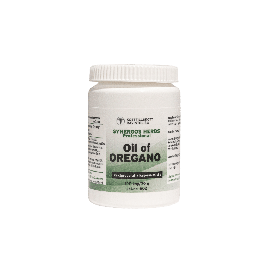 Ingredienser: Oregano olja, fyllnadsmedel (kalciumkarbonat, mikrokristallin cellulosa), syrafast kapsel (hydroxipropylmetylcellulosa).