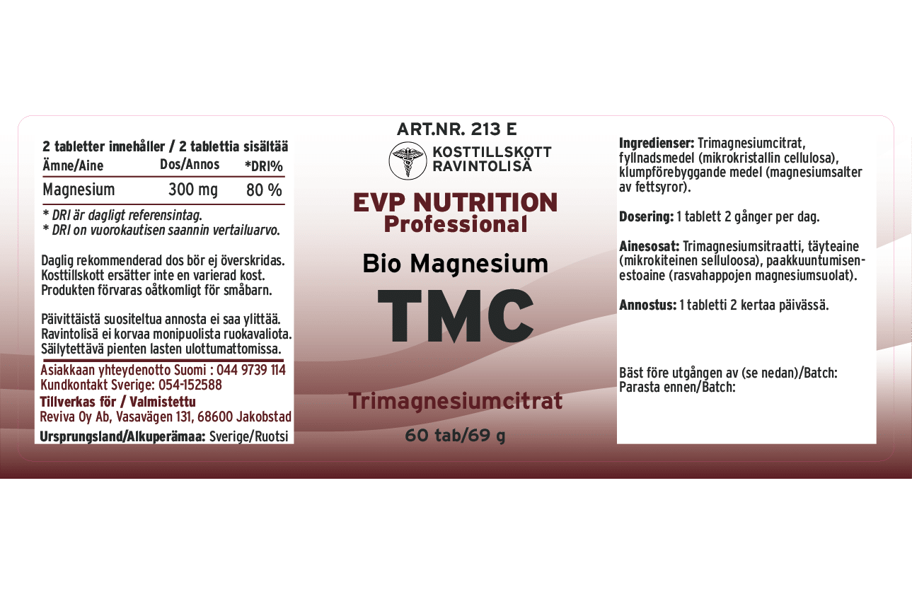 Ingredienser: Trimagnesiumcitrat, fyllnadsmedel (mikrokristallinsk cellulosa), klumpförebyggande medel (magnesiumsalter av fettsyror).